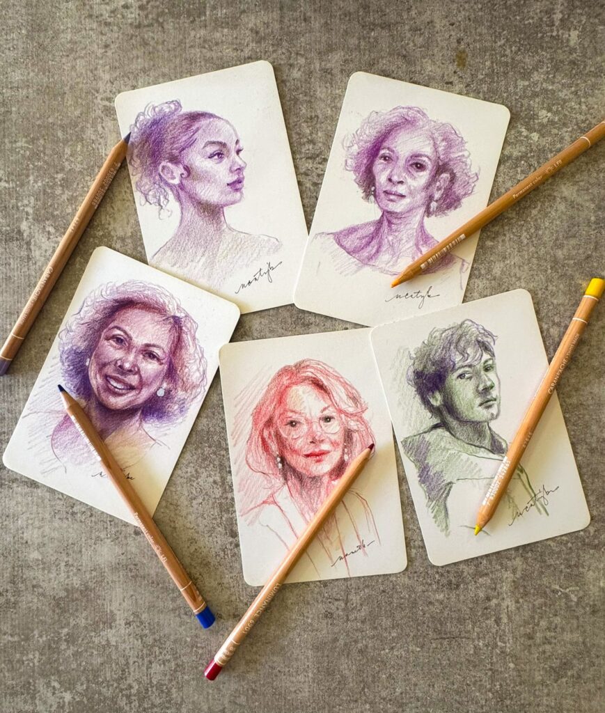 Expressive postcard portraits using colorful brush pens and acrylic/ink.